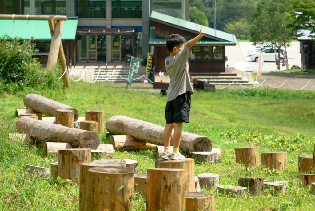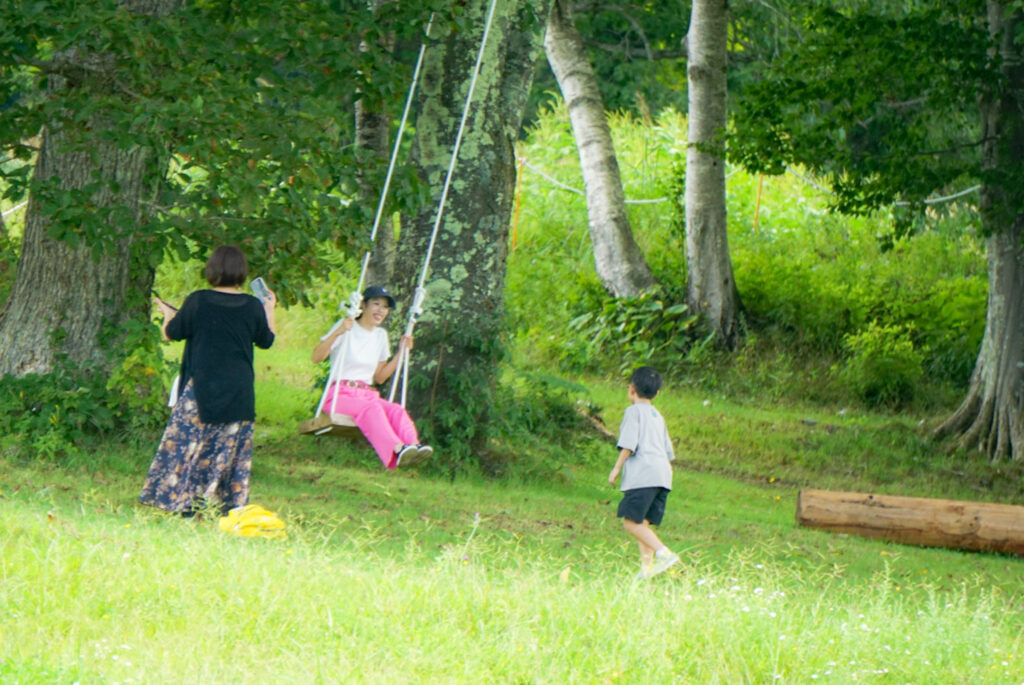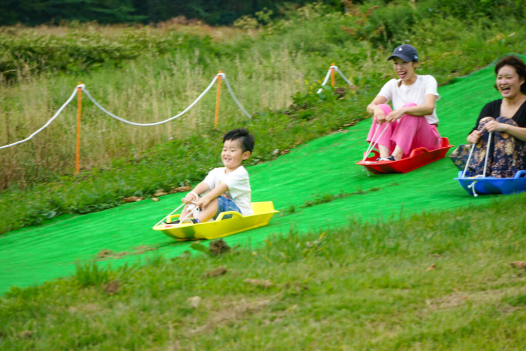 「黒姫の森プレイランド〜soto〜」は、広大な芝生と木々に囲まれた、思いっきり体を動かせる屋外あそびエリアです。木製アスレチックやブランコ、トランポリンなどの遊具に加え、スリル満点のマウンテンカート(ダウンヒルカート)や芝そりも楽しめます。どこまでも続く芝の上で走ったり、跳ねたり、滑ったり。黒姫の自然に包まれながら、子どもも大人も思いっきり遊べる、高原のアクティブスポットです。
