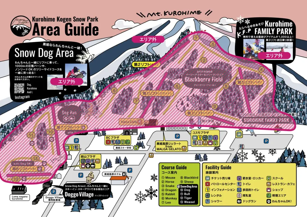 赤い網掛けで示したエリア外は、当ゲレンデ安全管理区域外です。